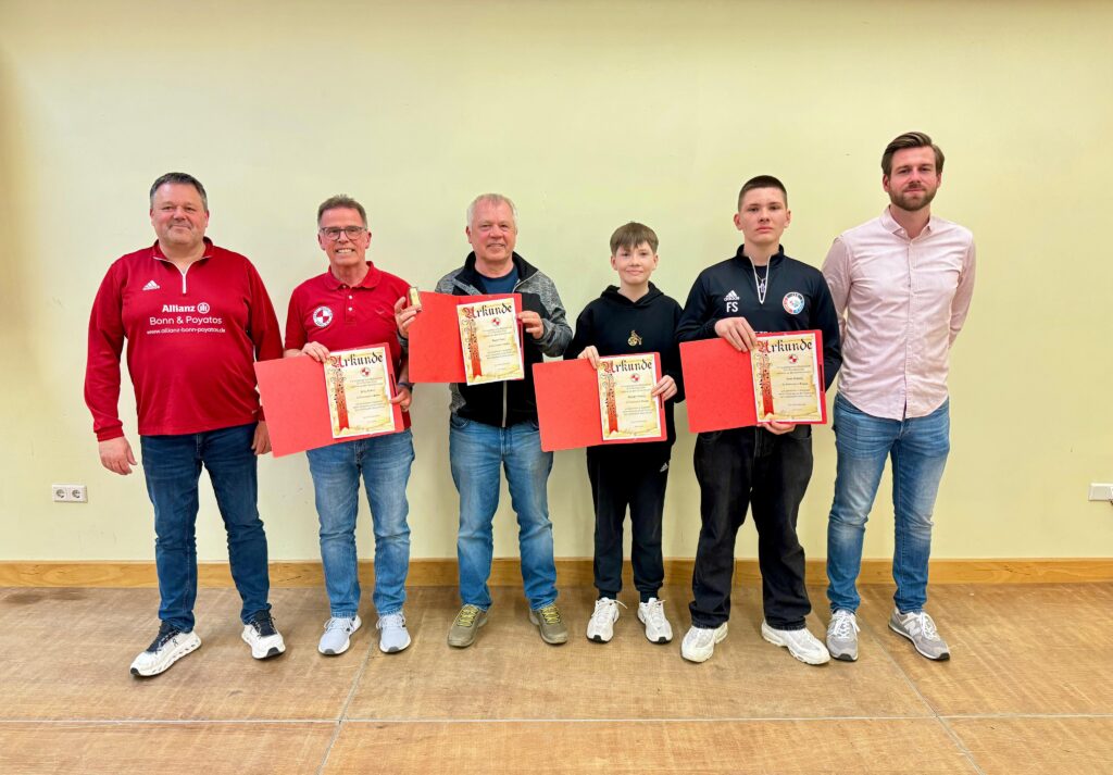 2026: 20.März: Der 1. Vorsitzende L. Bonn u. 2. Vorsitzende M. Handschuhmacher des FV Erpel mit den geehrten Mitgliedern Matthis Schmitz, Fynn Schmitz u. stellvertretend Thomas Siebert für (Fritz Siebert) u. Jürgen Bonn für (Marco Bonn).