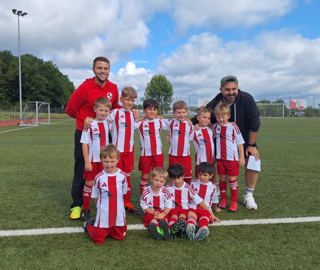 2025: 30.Aug.: Bambini FV Erpel mit ihrem Neuen Outfit und den Trainern Chris Meyer u. Sinan Zahterogullari.