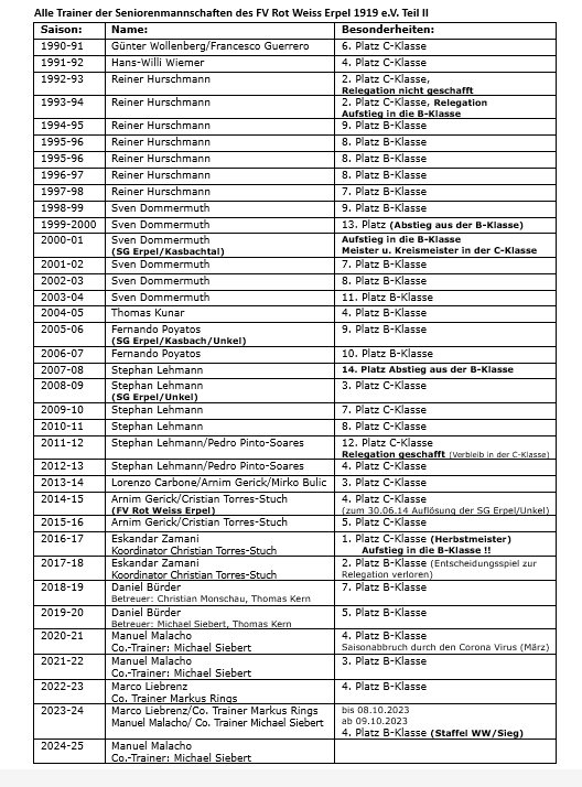 Nachdem das Trainerduo Liebrenz/Rings vor zwei Wochen ihr Traineramt zur Verfügung gestellt hatte, galt es schnell eine kurzfristige Lösung zu finden. Vielen Dank für die fast 1 1/2 Jahre geleistete Trainer Tätigkeit beim FV Erpel. Für die Zukunft wünschen wir euch alles Gute. Zum Glück hat man in Manuel Malacho einen Trainer gefunden, der die Mannschaft noch gut kennt und aus alter Freundschaft die Mannschaft bis zur Winterpause trainiert. Michael Siebert wird ihn wie vor 2 Jahren auch als Co-Trainer unterstützen. Herzlich willkommen zurück und auf eine schöne und erfolgreiche Zeit.