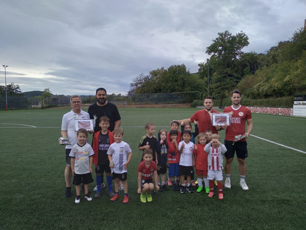 2025: 29. August: Die Bambini des FV Erpel „op de Kipp“ bei der Verabschiedung von Thomas u. Michael Siebert mit den neuen Trainern Chris Meyer u. Sinan Zahterogullari.