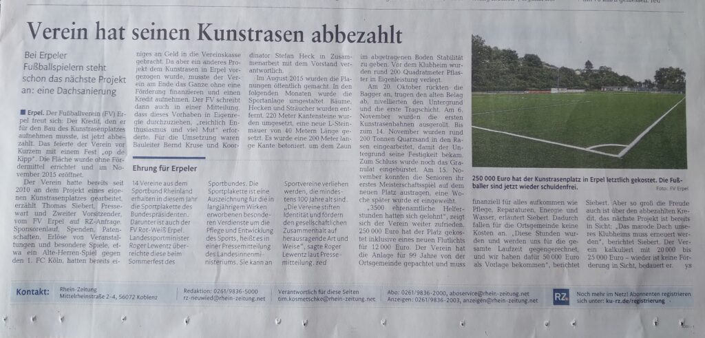 Da das Clubheim Dach in die Jahre gekommen ist und schon seit Jahren undicht ist, kam der FV Erpel nicht um ein neues Dach herum. Unter Anleitung des Dachdecker Betriebes Gero Schulte konnte man das alte Dach, unterstützt von 25 ehrenamtlichen Helfern, an einem Samstag Vormittag abreißen. Wiederum ein riesiges Objekt (finanziell) für den FV Erpel, leider wieder ohne Förderung. Großer Dank gilt der Floreat Erpilla Margarete und Gregor Noll Stiftung, des AEV (Arbeitskreis Erpeler Vereine), der Firma Gero Schulte, privater Personen, den Paten, Freunden und Helfern für die tolle Unterstützung, um das Objekt in Angriff nehmen zu können. Das Resultat kann sich sehen lassen und mit dem Trapezblechdach hat man in den nächsten Jahren Ruhe. Im Anschluss stehen weitere Arbeiten an (Dusche, WC’s etc.) die mehr als notwendig sind. Der FV Erpel packt es an und mittlerweile hat man 3.700 ehrenamtliche Stunden in die Sportanlage investiert.