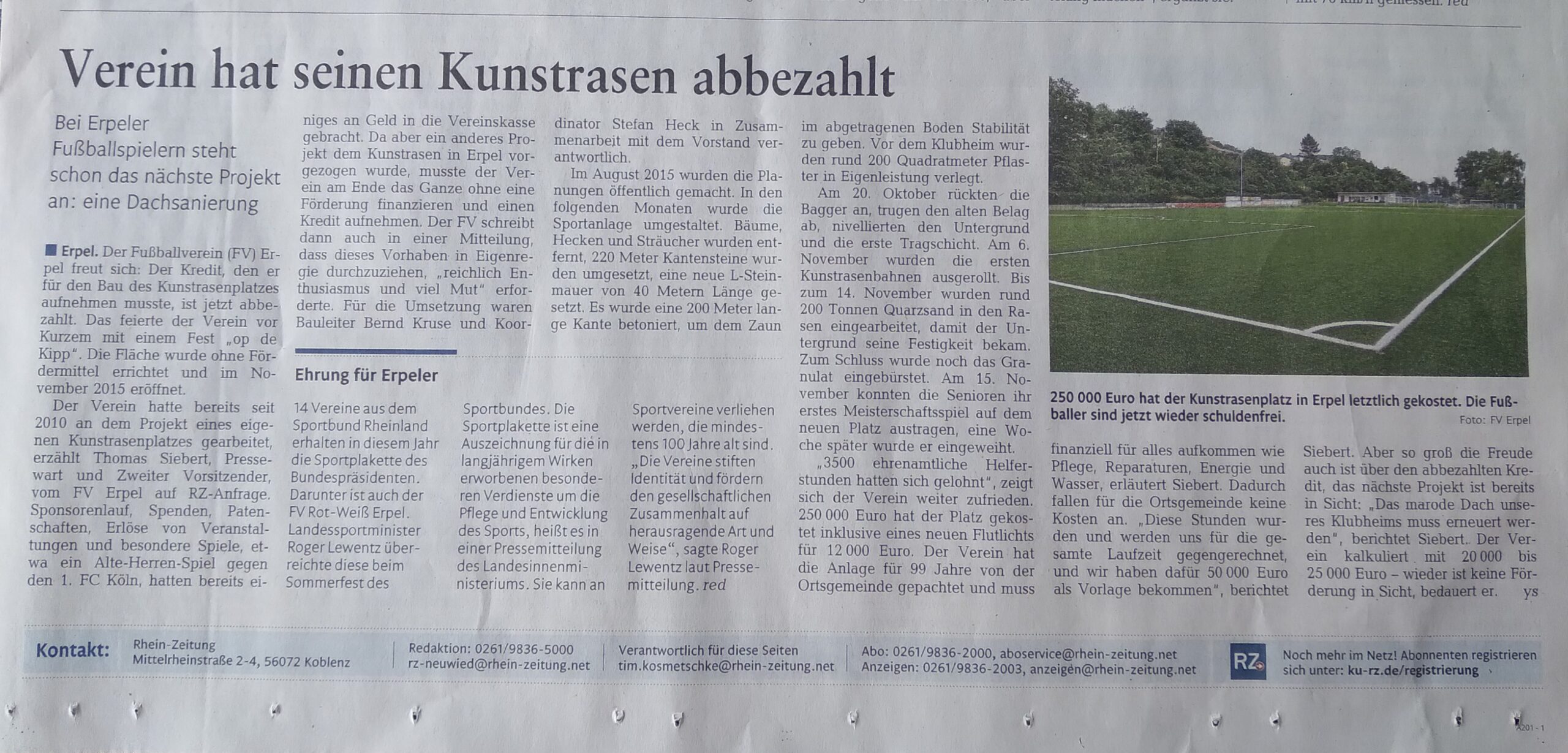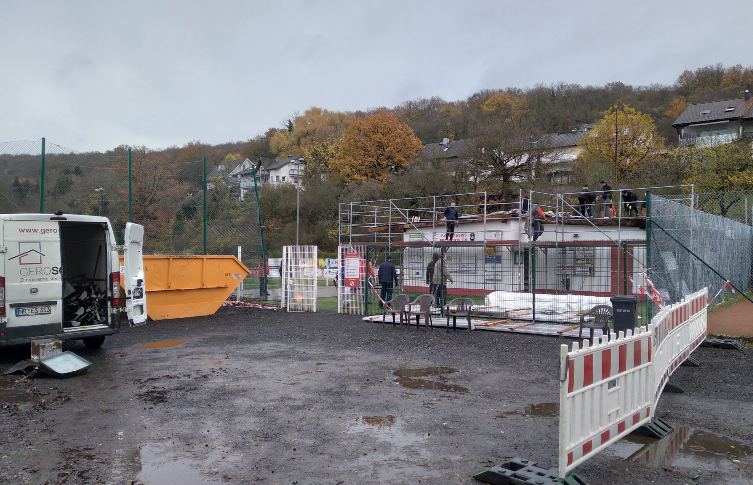 Da das Clubheim Dach in die Jahre gekommen ist und schon seit Jahren undicht ist, kam der FV Erpel nicht um ein neues Dach herum. Unter Anleitung des Dachdecker Betriebes Gero Schulte konnte man das alte Dach, unterstützt von 25 ehrenamtlichen Helfern, an einem Samstag Vormittag abreißen. Wiederum ein riesiges Objekt (finanziell) für den FV Erpel, leider wieder ohne Förderung. Großer Dank gilt der Floreat Erpilla Margarete und Gregor Noll Stiftung, des AEV (Arbeitskreis Erpeler Vereine), der Firma Gero Schulte, privater Personen, den Paten, Freunden und Helfern für die tolle Unterstützung, um das Objekt in Angriff nehmen zu können. Das Resultat kann sich sehen lassen und mit dem Trapezblechdach hat man in den nächsten Jahren Ruhe. Im Anschluss stehen weitere Arbeiten an (Dusche, WC’s etc.) die mehr als notwendig sind. Der FV Erpel packt es an und mittlerweile hat man 3.700 ehrenamtliche Stunden in die Sportanlage investiert.