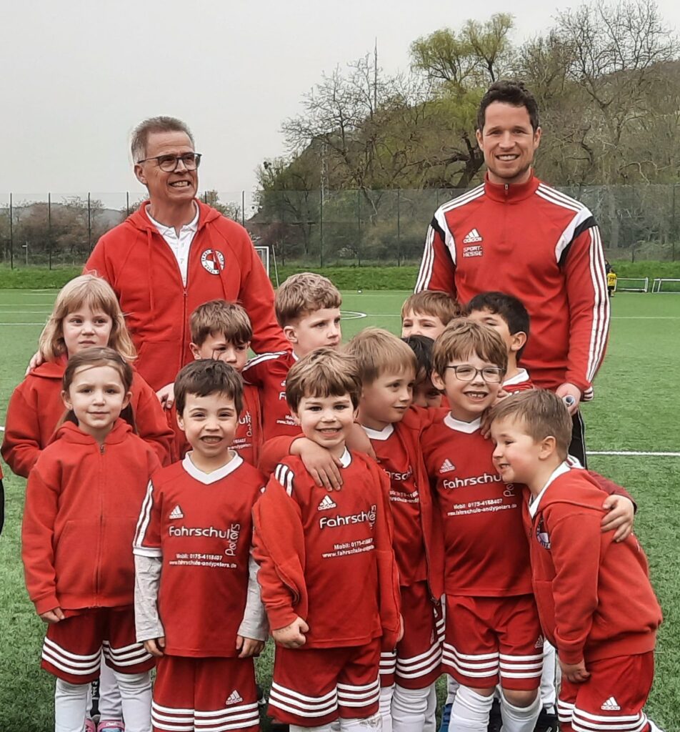 2022 Juni: F-Jugend mit neuen Trikots. Trainer Frank Kotthoff, Betreuer Patrick Harth.