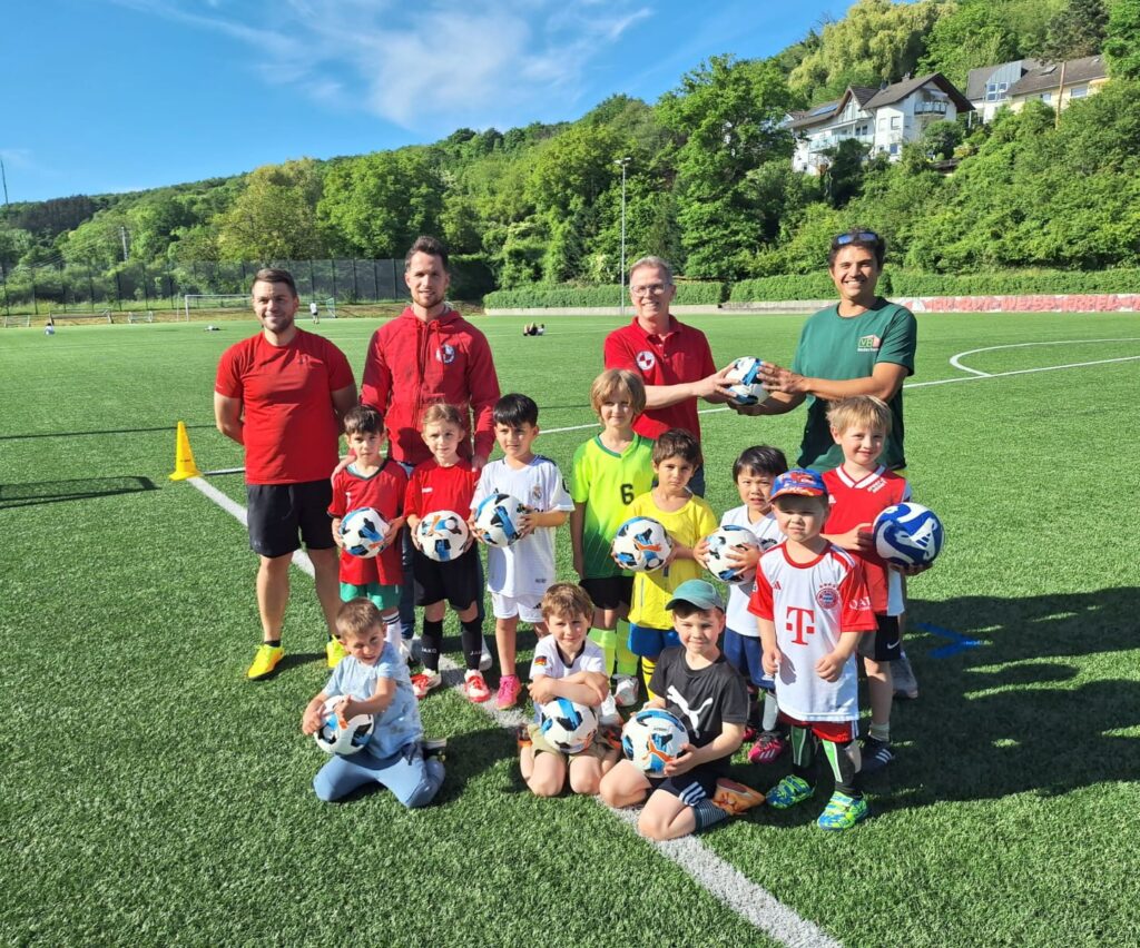 2025: 16. Mai: Lorant van Brummen bei der Übergabe der neuen Bälle an die Bambini des FV Erpel. Die Trainer Chris Meyer, Michael Siebert u. Thomas Siebert freuen sich mit den Kleinsten des Vereins.