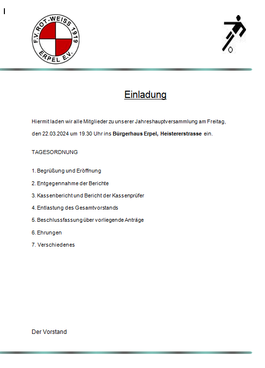 Am Freitag, den 22.03.2024 fand die Jahreshauptversammlung des FV Erpel statt. Der 1. Vorsitzende Lothar Bonn begrüßte 33 Mitglieder. Es folgte eine Gedenkminute für das verstorbene langjährige Mitglied Reinhold Suhr. Geschäftsführer Jürgen Kochems berichtete, dass der Verein zurzeit 270 (255 Ende 2023) Mitglieder hat. Davon sind 112 aktive Jugendliche u. 56 aktive Senioren im Spielbetrieb. Der Rest teilt sich in Inaktive Mitglieder, Alte Herren, Hobby u. Rentner auf. Erfreulich sei der Zuwachs bei den Mitgliedern, sowie Jugendlichen der letzten Jahre. Die I. Mannschaft belegt aktuell den 4. Platz in der B-Klasse unter dem Trainerduo Malacho/Siebert. Nach dem 9. Spieltag hatte das Trainergespann Liebrenz/Rings den Trainerposten zur Verfügung gestellt. Die II. Mannschaft spielt in der Kreisliga C unter Markus Alscher und belegt den 12. Platz. Es gibt ja keine D-Klasse mehr und somit blieb man in der C-Klasse, obwohl man sportlich abgestiegen war. Für beide Mannschaften haben die Trainer für die Saison 24/25 zugesagt. Das Soll der fehlenden Schiedsrichter wurde endlich erfüllt und mit Hans-Werner Bald und Marc Odink stellt man nun wieder zwei eigene Schiedsrichter. Das Dach des Vereinsheimes wurde in Eigenleistung instandgesetzt und auch hier waren zahlreiche Senioren- u. AH-Spieler im Einsatz. Das Erneuern des Duschtraktes und der Decken wird in Zukunft in Angriff genommen, ebenso das Aufstellen des Geräte Schuppen. Markus Riegel berichtete über die Alten Herren Erpel und deren sportliche Aktivitäten des letzten Jahres. Ein Tennisturnier in Ohlenberg wurde durchgeführt und eine Weihnachtsfeier auf der Erpeler Ley. Winzerfest (unterstützt durch die Senioren und des Fanclubs) war man wie immer mit einem Weinstand präsent. Leider konnte man nur zwei Spiele bestreiten (1S/1N) Dieses Jahr ist eine Mannschaftstour nach Willingen geplant. Karneval 2025 soll wieder eine Fußgruppe des FV Erpel mitgehen, die Orga hat Cristian Torres-Stuch übernommen. Es folgten die Berichte von Jugendleiterin Gerlinde Weidenfeller und Jugendtrainer Fernando Bonn. Von den Bambini bis zur F-Jgd. ist man eigenständig. Von der E-bis C-Jgd. besteht eine JSG mit Unkel. In der B-Jgd. gibt es eine JSG mit Unkel/Rheinbreitbach. A-Jgd. gibt es leider noch keine. Seit Sommer gibt es einmal die Woche Torwart Training mit Lars Kubach, einen Social Media Auftritt und die frühzeitige Integration der Jugendspieler in den Seniorenbereich wird vorangetrieben. Schatzmeister Andreas Peters konnte aufgrund des neuen Clubheim Daches noch keine positiven Zahlen verkünden, was aber in absehbarer Zeit der Fall ist. Die Kassenprüfer Christian Efferoth und Harald Langenfeld hatten die Kasse geprüft und es haben sich keinerlei Beanstandungen ergeben. Christian Efferoth schlug die Entlastung des Gesamtvorstandes vor. Jürgen Bonn wurde zum Versammlungsleiter gewählt und bat um Entlastung des Gesamtvorstandes. Dem wurde von der Versammlung einstimmig zugestimmt. Zum Kassenprüfer wurden Christian Efferoth und Jürgen Bonn gewählt. Am 06. April um 8.00 Uhr findet wieder ein Arbeitseinsatz op de Kipp statt. Es folgte die Ehrung langjähriger Mitglieder durch den 2. Vorsitzenden Thomas Siebert. Die Ehrennadel in Bronze und eine Urkunde für 10 Jahre erhielten: Lucas Riegel, Christian Monschau, Arnim Gerick, David Jünemann, Maxim Kolfenbach, Neil Brügger, Julian Fröhlich, Dan Marculeti, Oliver Derigs, Lenny Noah Gries.  Die Ehrennadel in Silber und eine Urkunde für 25 Jahre erhielten: Florian Schneider, Beate Sieberz, Sebastian Krupp, Tobias Krupp, Frank Grefrath. Die Ehrennadel in Gold und eine Urkunde für 50 Jahre erhielt: Edgar Neustein und wurde zum Ehrenmitglied des FV Erpel ernannt. Lothar Bonn bedankte sich im Namen des Vorstandes für die tolle Unterstützung im Verein, vor allem bei den Trainern und Betreuern rund um die zahlreichen Mannschaften. Um 20.35 Uhr beendete er die Versammlung.