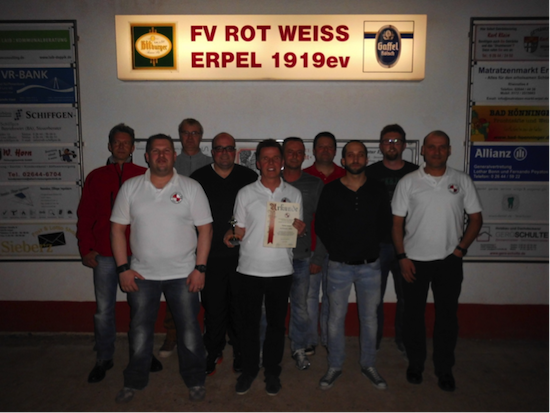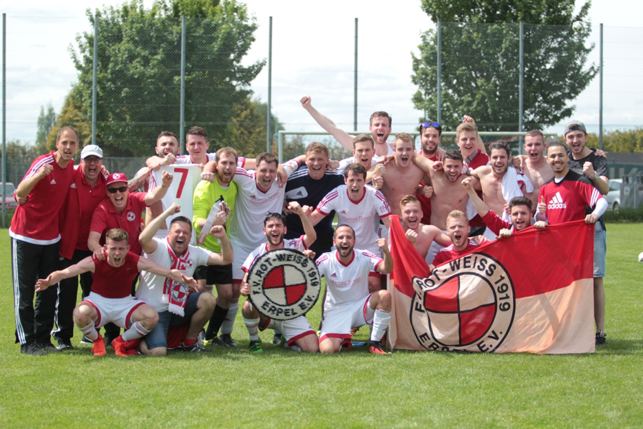 Im alles entscheidenden Spiel reisten die Spieler des FV Erpel mit ihren Fans im Bus nach Hüllenberg, um bei der SG Feldkirchen/H. II endlich die Meisterschaft klar zu machen. Man hatte ja drei Punkte Vorsprung vor Bad Hönningen und benötigte mindestens einen Punkt. Vor rund 90 mitgereisten Fans in Rot-Weiß wirkten die Jungs etwas nervös, kamen nicht richtig ins Spiel und lagen schon in der 10. Min. mit 0:1 im Rückstand. Der erste Fehler in der Abwehr wurde mit einem Direktschuss an den Innenpfosten bestraft. Nun musste sich zeigen, ob die jungen Spieler ihre Nerven im Griff hatten. Schnell hatte man sich wieder gefunden und diktierte nun das Spiel. In der 28. Min. wagte sich Innenverteidiger Dominic Diener mit Macht in des Gegners Strafraum und flankte perfekt auf Denis Schneider, der mit einem platzierten Schuss dem Torwart keine Chance ließ, es stand 1:1. Das gab den erwarteten Auftrieb und die Rot Weißen ließen einen Angriff nach dem anderen Richtung Feldkirchener Tor folgen. Leider stand man oftmals im Abseits, oder war vor dem Tor nicht konzentriert genug, um zum Erfolg zu kommen. Mit dem Unentschieden konnte man aber leben, da man damit Meister war. In der 2. Halbzeit wurde das Spiel des FV Erpel immer dominanter und in der 49. Min. traf Youngster Fernando Bonn zum vielumjubelten 2:1, als er einen verunglückten Ball vom Torwart aufnehmen konnte und eiskalt verwandelte. Nun war der Bann gebrochen und es wurde ein tolles Spiel der Rot Weißen. Nach herrlicher Vorarbeit von Florian Schneider, konnte Goalgetter George Bikhan in der 63. Min. eiskalt zum entscheidenden 3:1 verwandeln und das Spiel war entschieden. Mit dem 4:1 in der 67. Min. durch wiederum G. Bikhan, der mit 43 Treffern die Torjägerkrone holte, wurden die Fans u. Verantwortlichen noch entspannter. Wieder hatte F. Schneider glänzend vorbereitet. Den Schlusspunkt zum 5:1 Markierte Thomas Kern in der 83. Min. u. wurde von seinen Mitspielern begeistert gefeiert, hatte er doch eine lange Leidenszeit hinter sich. Wieder hatte F. Schneider den perfekten Ball gespielt. Nach dem Schlusspunkt gab es kein Halten mehr und es gab einen Riesen Freudentaumel. Dank an die Verantwortlichen der SG Feldkirchen/H., die das ermöglicht haben. Danach fuhr man mit dem Party Fan Bus Richtung Heimat zur Kipp und dort gab es dann eine Mega-Party für Spieler, Fans u. Verwandten. Bis spät in die Nacht wurde gefeiert und es sind auch sicherlich ein paar Tränen geflossen. Die letzte Meisterschaft holte man in der Saison 2000/2001 als SG Erpel/Kasbachtal mit Trainer Sven Dommermuth. Nun hatte es 16 Jahre gedauert, ehe man unter Trainer Eskandar Zamani eine Meisterschaft als FV Rot Weiß feiern konnte. 17 Spieltage war man Tabellenführer, Herbstmeister, hat die meisten Treffer (124) erzielt und die wenigsten (20) kassiert. Das hat es in den letzten Jahren auch nicht gegeben, dass drei Mannschaften bis zum Schluss um die Meisterschaft mitgespielt haben. Bad Hönningen und die SG Niederbreitbach II waren starke Gegner und haben es einem nicht leicht gemacht.