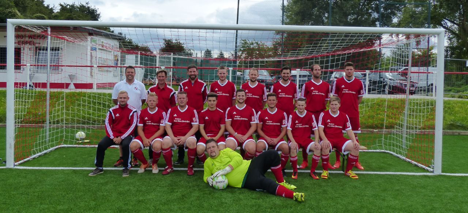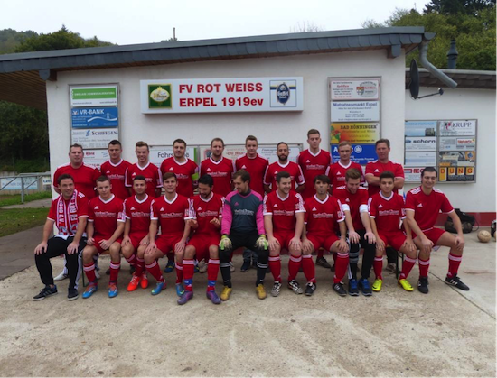 2. Mannschaft des FV Rot-Weiss Erpel 2016/17 – Oben links: 1. Vors. Lothar Bonn, Trainer Arnim Gerick, Daniel Straußfeld, Stephan Weber, David Jünemann, Co.-Trainer Cristian Torres-Stuch, Dennis Pitsch, Christian Hausen. Sitzend links: Sascha Alscher, Simon Kanschik, Christian Löhr, Julian Poyatos, Carsten Trauwein, Lukas Gerick, Kai-Lukas Kessler, Maximilian Schneider TW: Sebastian Koch.