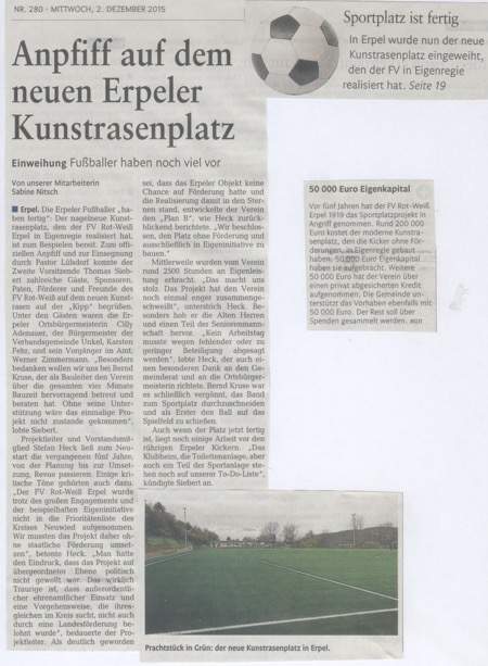 Unter dem Motto „Kunstrasenplatz in Erpel – Ich bin dabei“ fand am 27. Mai 2011 eine Informationsveranstaltung des FV Rot-Weiß Erpel im Bürgersaal in Erpel statt. Eingeladen waren Mitglieder, Eltern und Jugendliche sowie Freunde und Förderer des Fußballvereins. Über 80 Personen sind der Einladung gefolgt. Im Rahmen einer Präsentation informierte der Vorstand über das sportliche Konzept sowie über den Stand des Projektes „Kunstrasenplatz“. Der erste Impuls kam vor rund neun Monaten. In einer Vorstandssitzung wurde nach intensiven Diskussionen beschlossen, das Projekt „Kunstrasenplatz“ anzustoßen, da die sportlichen Rahmenbedingungen - insbesondere im Jugendbereich - hervorragend sind. Aber auch die gute Infrastruktur in Erpel, die Attraktivität als Wohnort für Familien und nicht zuletzt die Gespräche der Vereinsverantwortlichen mit den Eltern haben die Vereinsführung zu diesem Schritt ermutigt. In der Präsentation wurde deutlich, dass der FV Rot-Weiß-Erpel in Spielgemeinschaft mit dem FC Unkel 80 einen entscheidenden Beitrag zur Förderung der Jugend leistet. Zur Zeit sind über 100 Kinder im Spielbetrieb, denen durch engagierte Trainer eine sinnvolle regelmäßige Beschäftigung geboten und damit der Spaß am Fußball vermittelt wird. Die Kinder werden von der Straße weggeholt und erhalten wichtige soziale Qualifikationen. Gemeinsam mit der Ortsgemeinde Erpel wurde im Herbst letzten Jahres der Antrag auf Aufnahme in die Prioritätenliste des Kreises Neuwied im Hinblick auf eine Förderung durch das Land Rheinland-Pfalz gestellt. Neben einer möglichen Landesförderung ist aber auch der Verein in hohem Maße gefordert, die Finanzierung sicherzustellen. Beim Rot-Weiß Erpel hat man sich dazu entschlossen, wie anderenorts ebenfalls erfolgreich praktiziert, den Vereinsanteil über Patenschaften sicherzustellen. Der Kunstrasenplatz wurde daher in 600 Anteile aufgeteilt. Jeder Anteil hat einen Wert von 25 €/Jahr. Für die nötige Planungs- und Finanzierungssicherheit ist eine 5-jährige Bindung erforderlich.